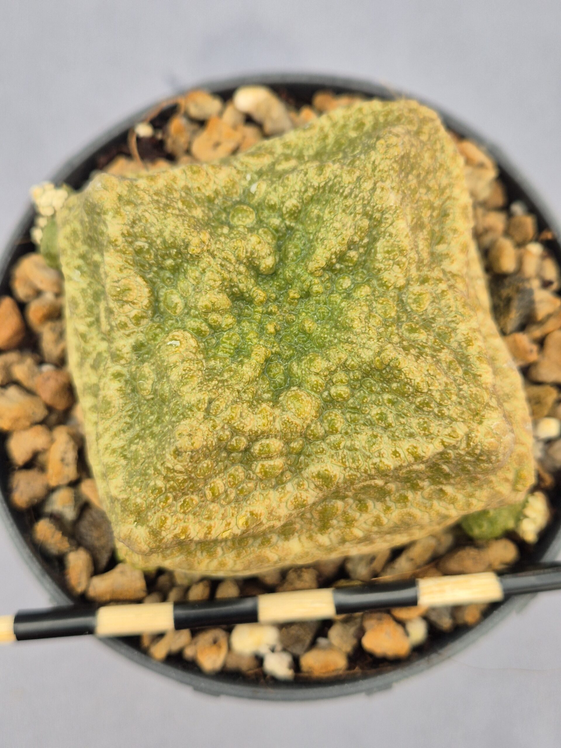 Este Pseudolithos cubiformis presenta un cuerpo perfectamente cúbico, con una superficie repleta de protuberancias que le da un aspecto casi mineral o pétreo. Su tono verde amarillento y su textura granulada lo convierten en una de las especies más singulares y llamativas dentro de las suculentas raras.