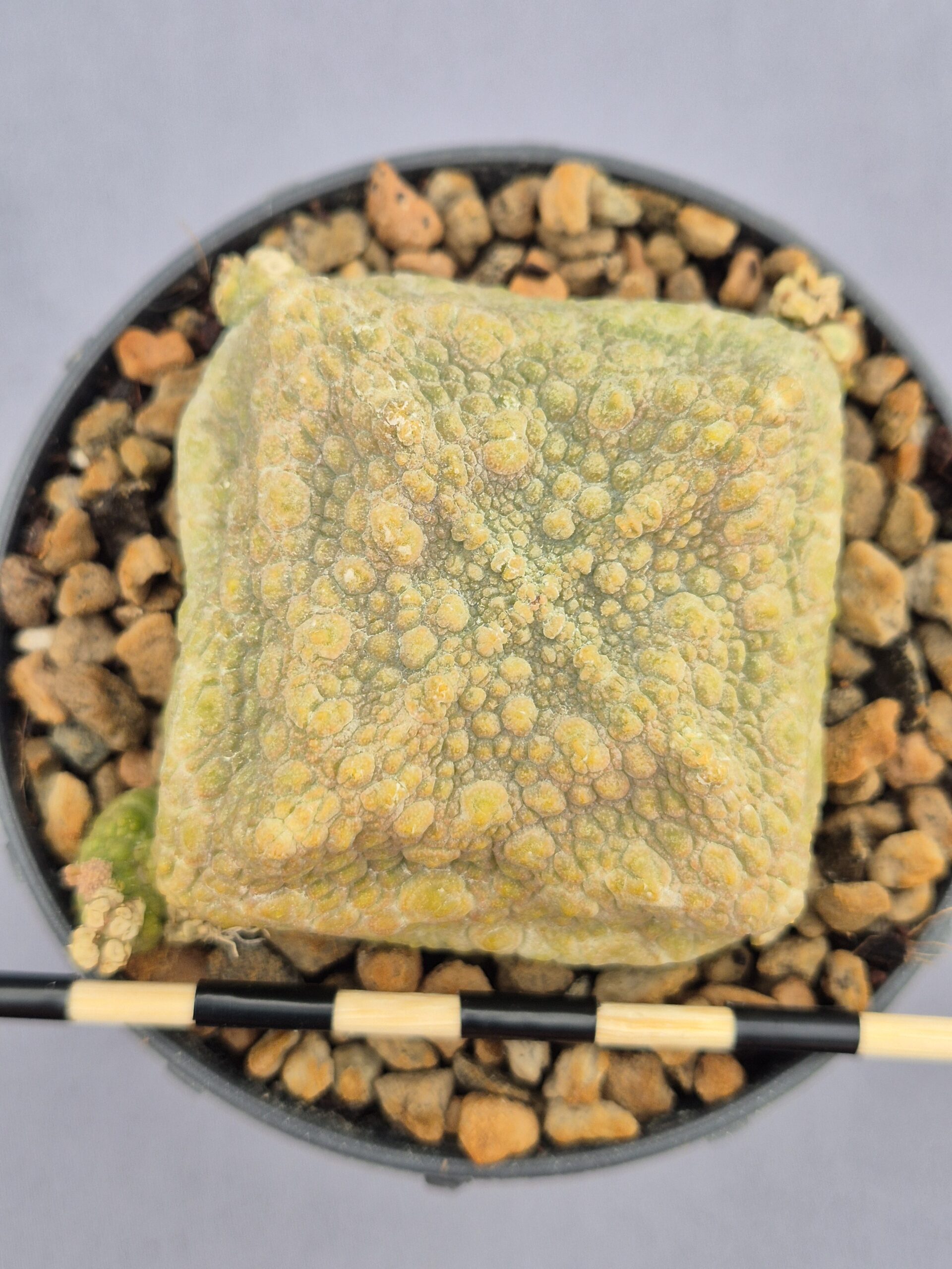 Este Pseudolithos cubiformis muestra una forma perfectamente cúbica y una superficie densa en protuberancias que le aporta un aspecto casi fósil o mineral. Su coloración amarillenta y verdosa, junto con su textura única, lo convierten en una de las suculentas más singulares y escultóricas del género.