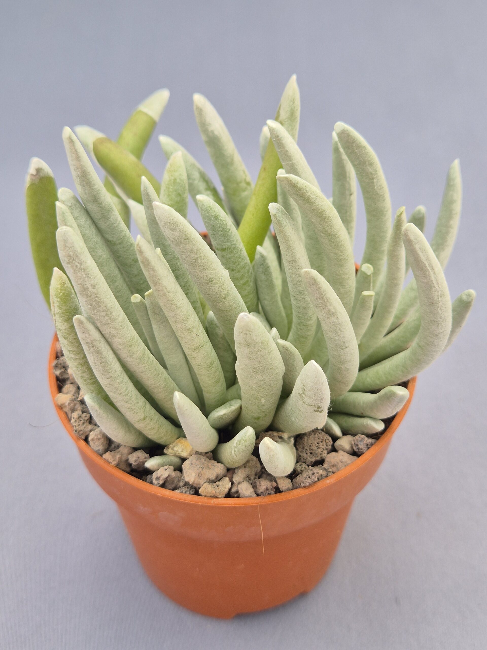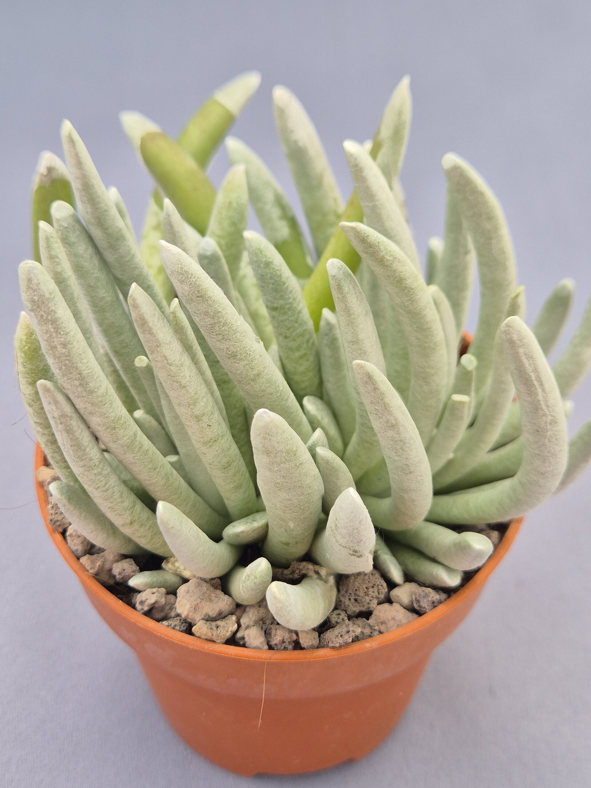 Suculenta compacta y muy decorativa, conocida por sus hojas cubiertas de una fina capa blanquecina que le da un aspecto plateado muy atractivo. Su forma ordenada y su textura la convierten en una planta ideal para colecciones especiales.