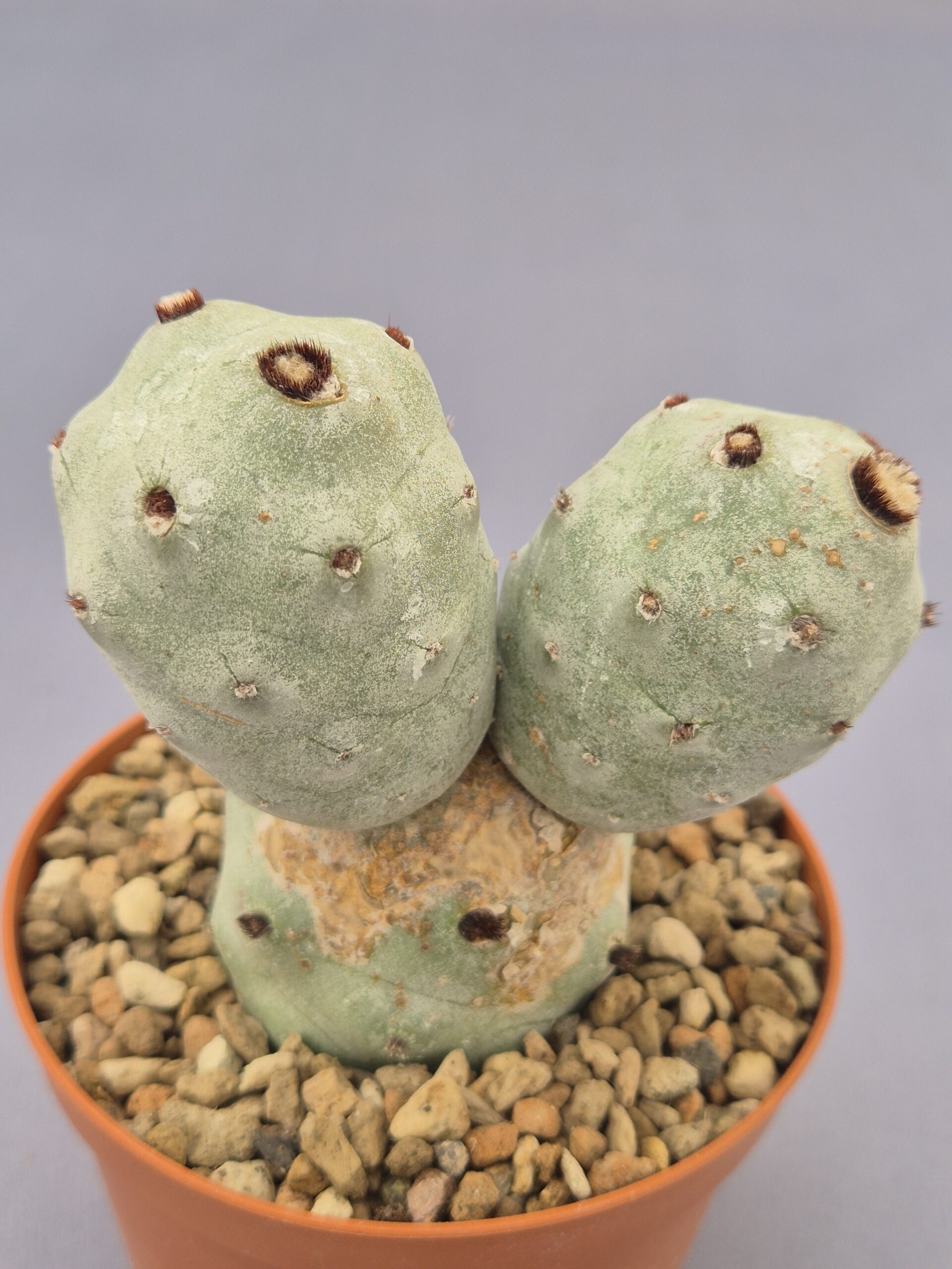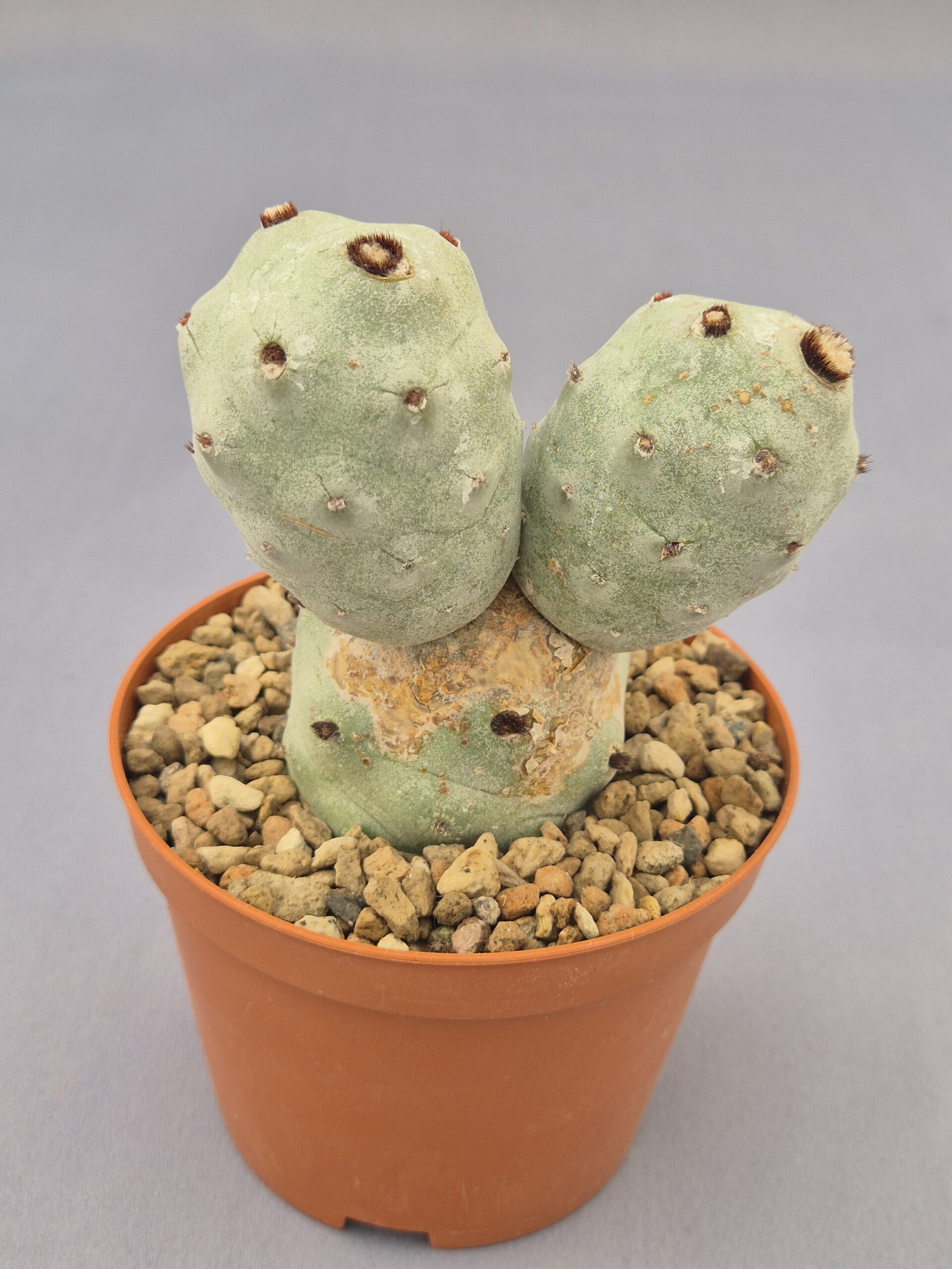 Tephrocactus articulatus var. calvus es un cactus muy singular dentro del género, conocido por sus segmentos lisos y prácticamente sin espinas. Su aspecto limpio y su forma articulada le aportan un carácter elegante y minimalista, muy apreciado por coleccionistas.