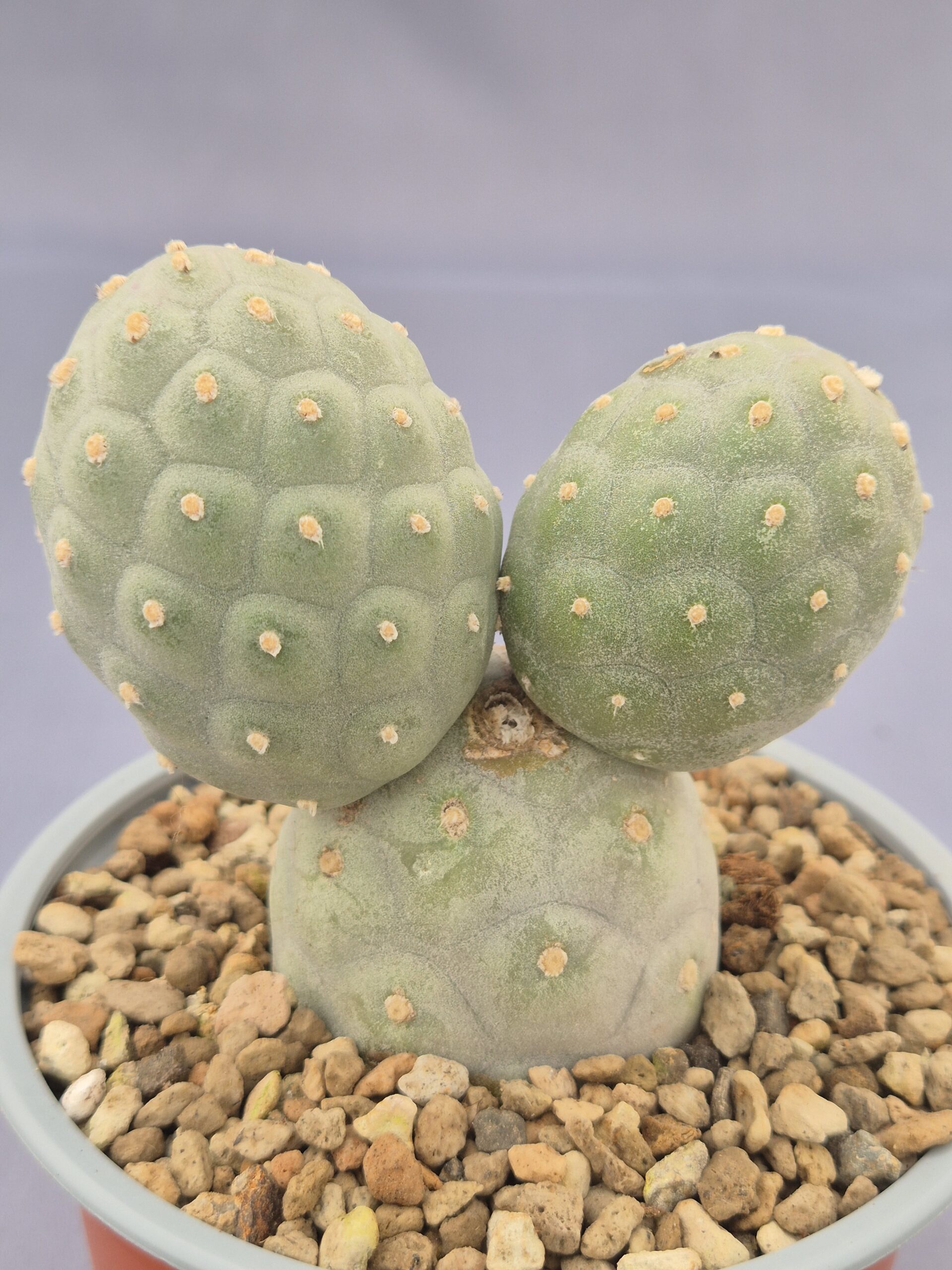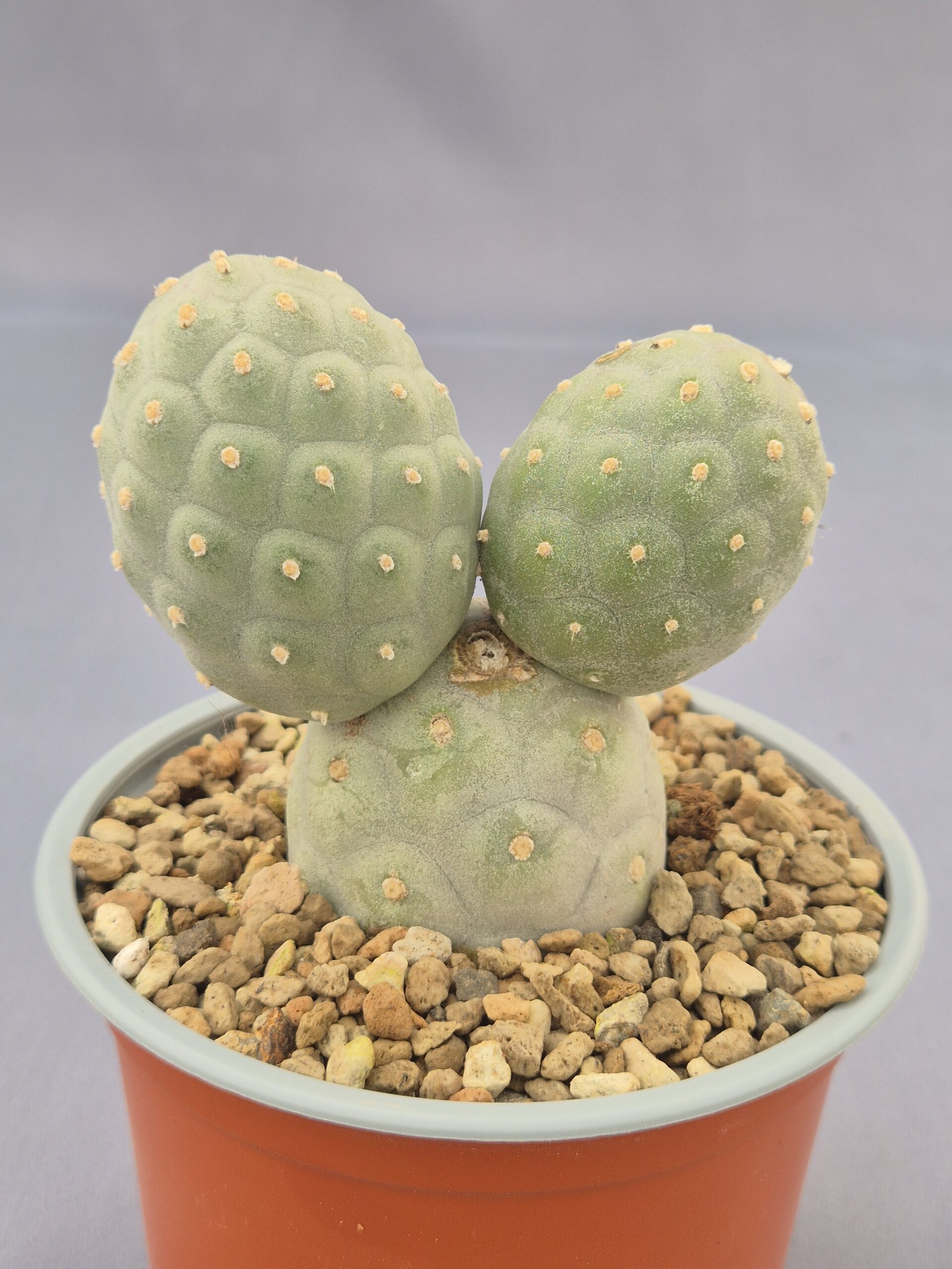 Tephrocactus geometricus es uno de los cactus más elegantes y buscados por coleccionistas debido a su forma perfectamente redondeada y su coloración azulada tan característica. Sus segmentos globosos y su crecimiento escultórico le dan un aspecto muy moderno y minimalista, convirtiéndolo en una auténtica pieza de colección dentro del mundo de los cactus raros.