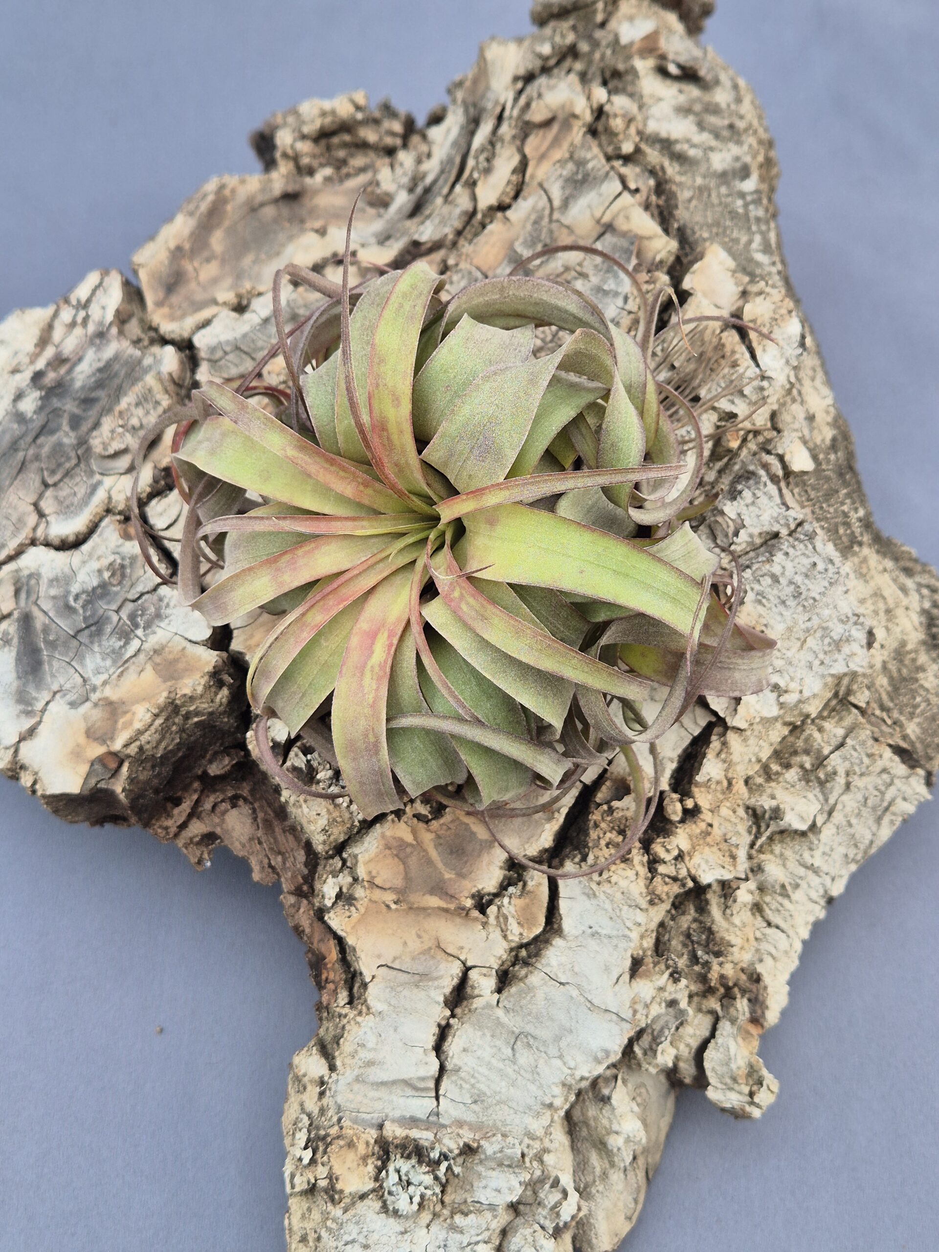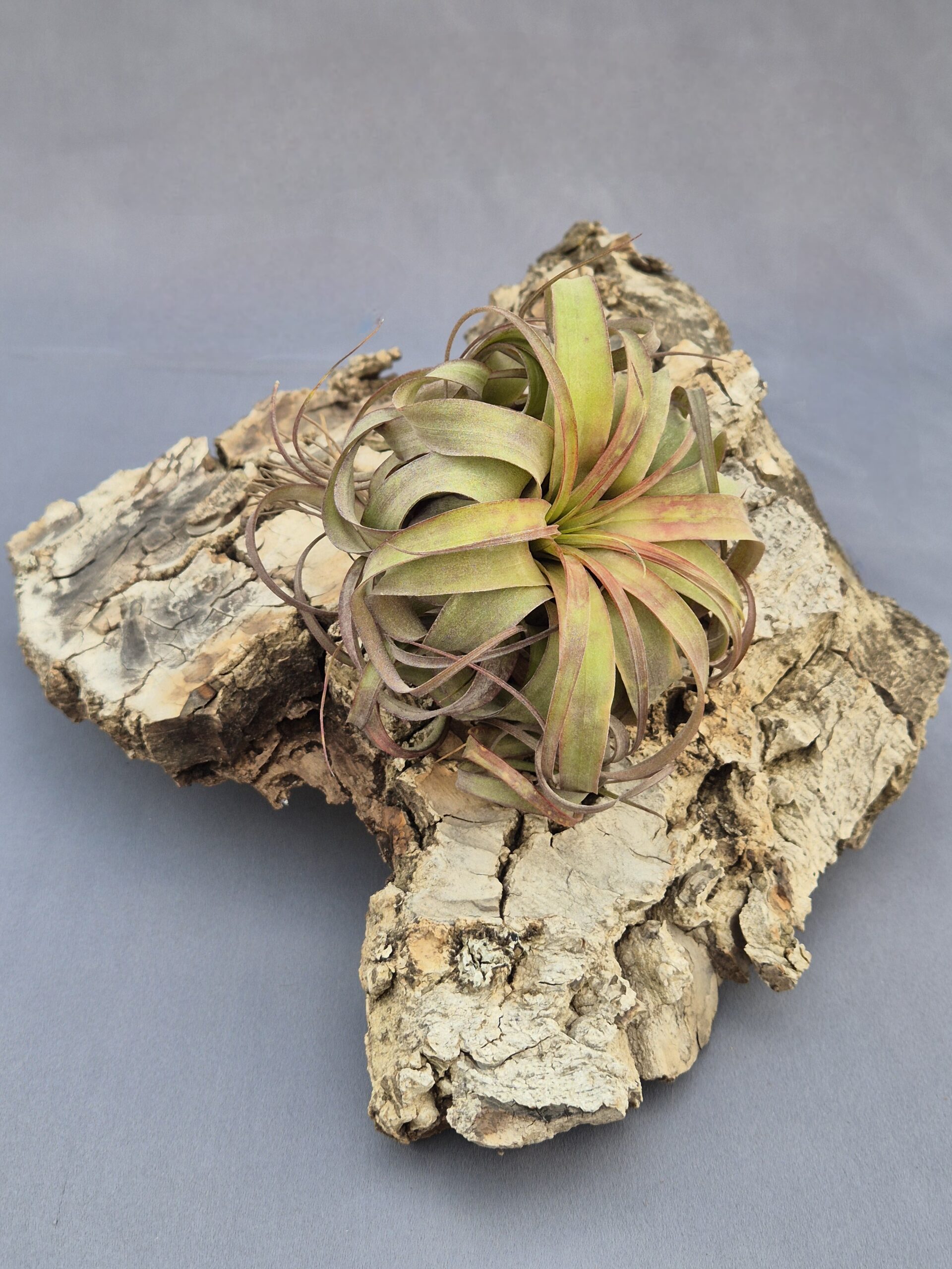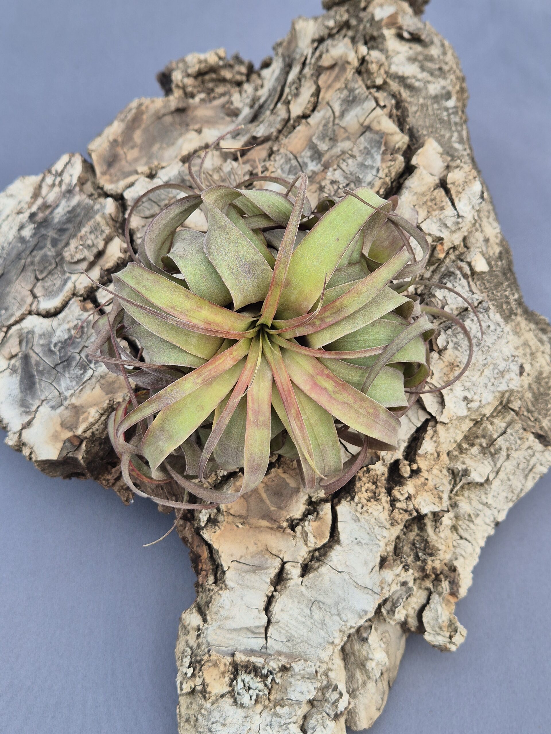 Esta hermosa Tillandsia destaca por su porte compacto y elegante, con un efecto visual muy equilibrado y lleno de movimiento. Sus hojas lisas y arqueadas se entrelazan suavemente, formando una roseta densa y armoniosa que combina tonos verdes con matices rojizos en las puntas, aportándole un aspecto cálido y cautivador. Es una pieza muy decorativa que atrae miradas desde cualquier ángulo.