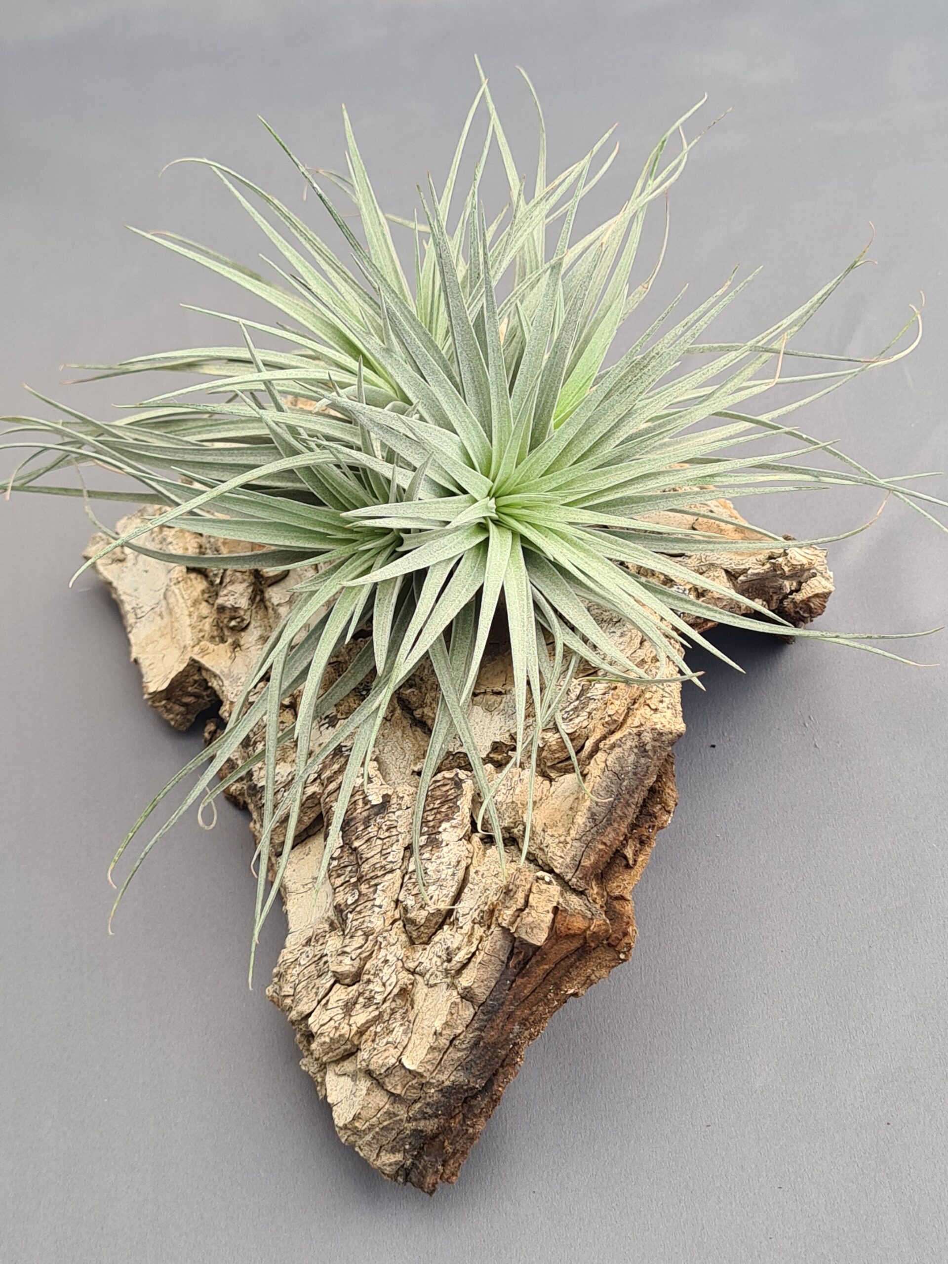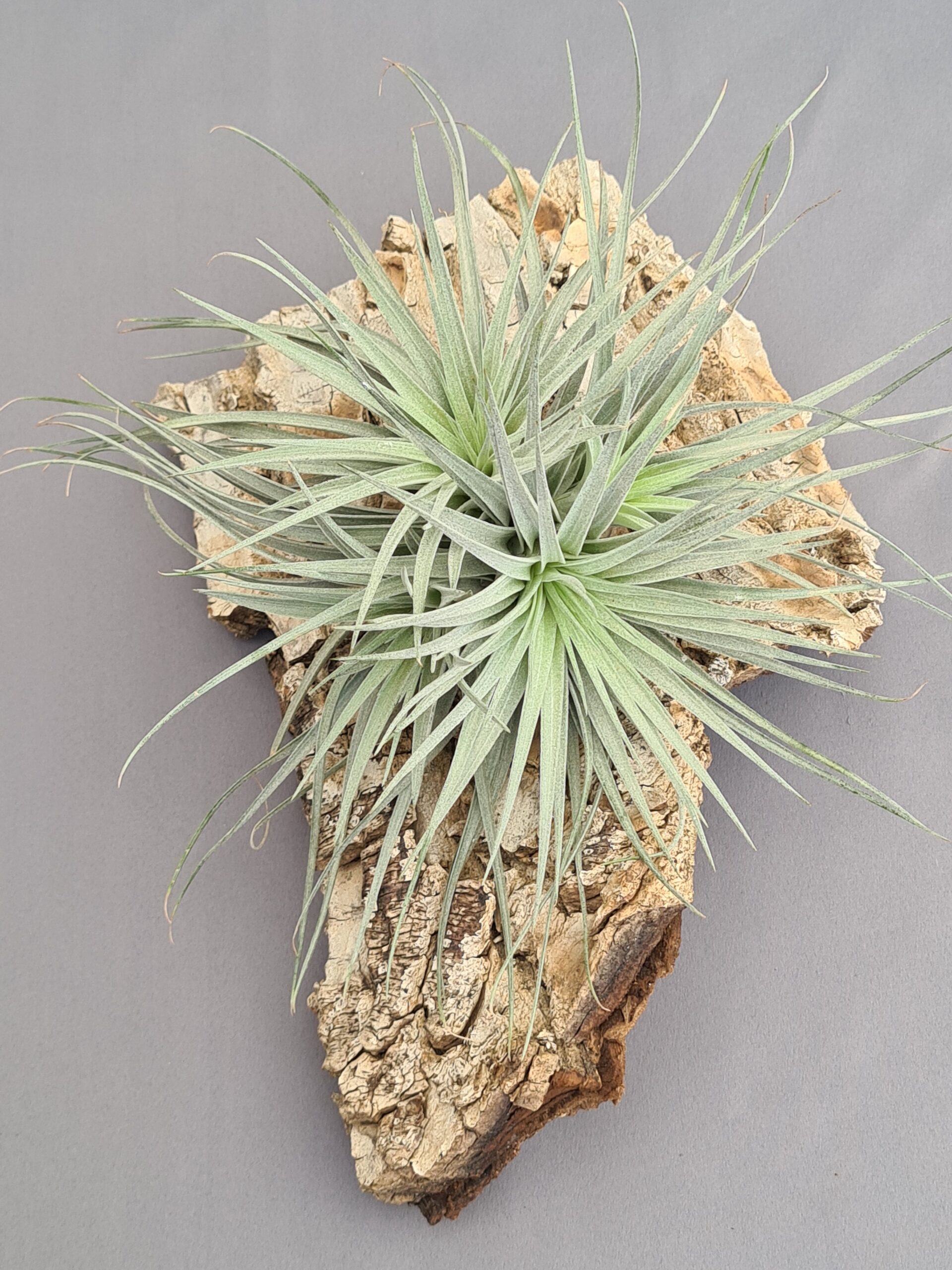 Esta impresionante Tillandsia destaca por su porte voluminoso y su belleza equilibrada. Sus hojas largas, finas y rígidas se abren en forma de estrella, creando una roseta amplia y muy arquitectónica. El tono plateado que recubre toda la planta, gracias a su abundante capa de tricomas, le da un aspecto luminoso y elegante, convirtiéndola en una pieza que atrae todas las miradas por su presencia única y sofisticada.