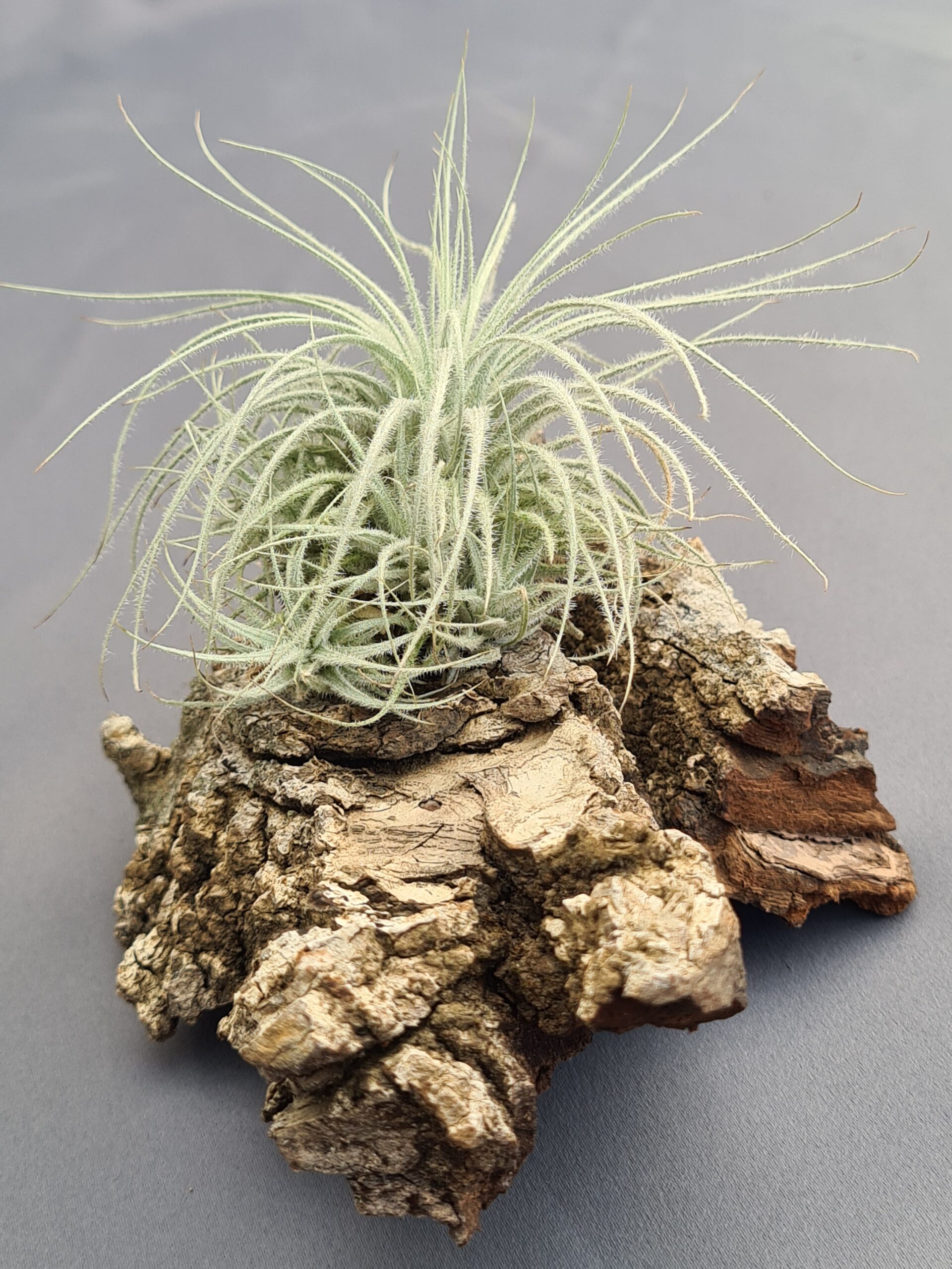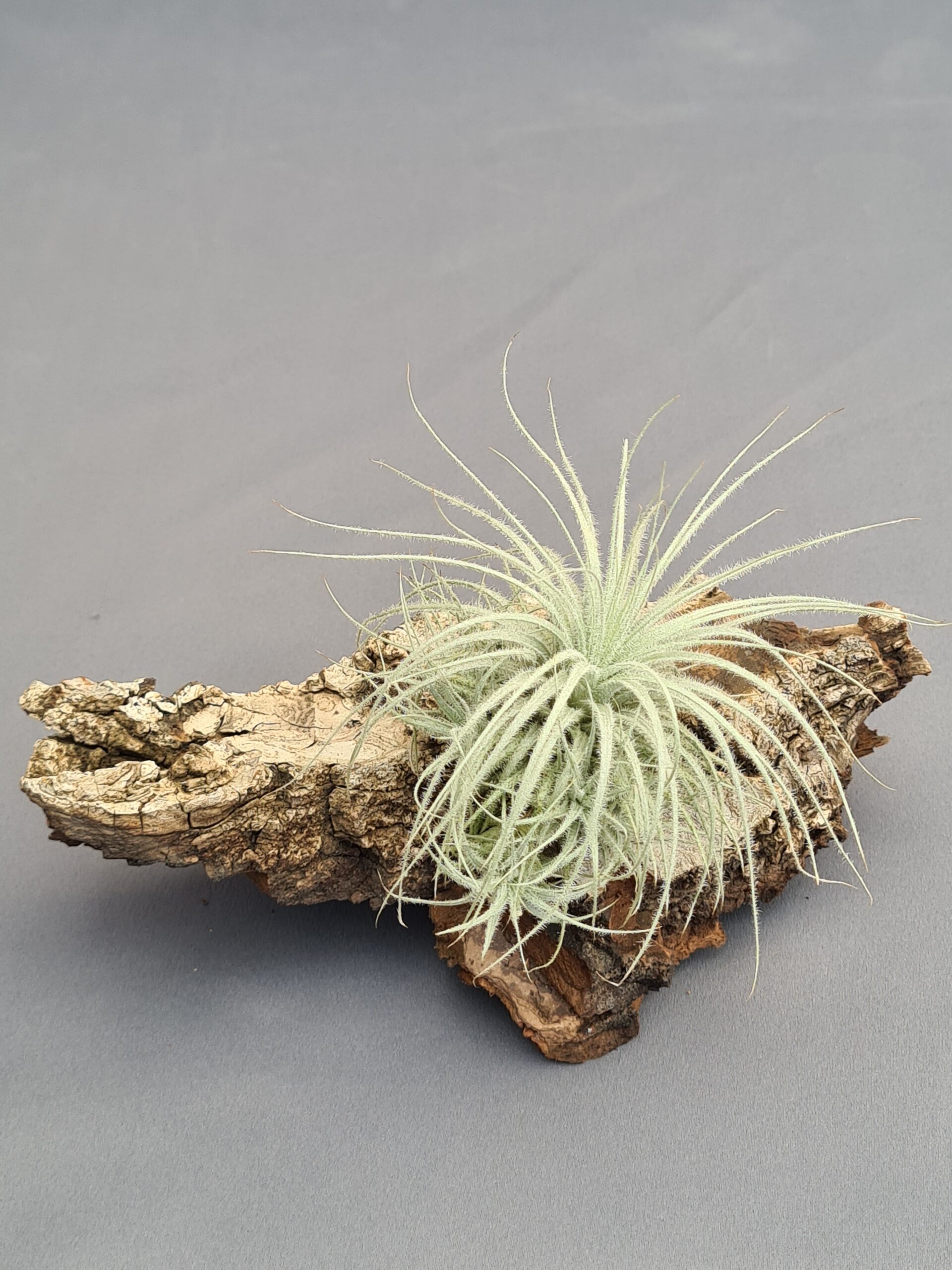 Esta preciosa Tillandsia enamora al instante por su porte etéreo y delicado. Sus hojas finas, suaves y alargadas se abren en forma de roseta ligera, mientras su tono blanco plateado —producto de sus abundantes tricomas— le aporta un brillo casi nevado que la hace única. Es una planta equilibrada, luminosa y con una presencia natural que destaca sin esfuerzo.