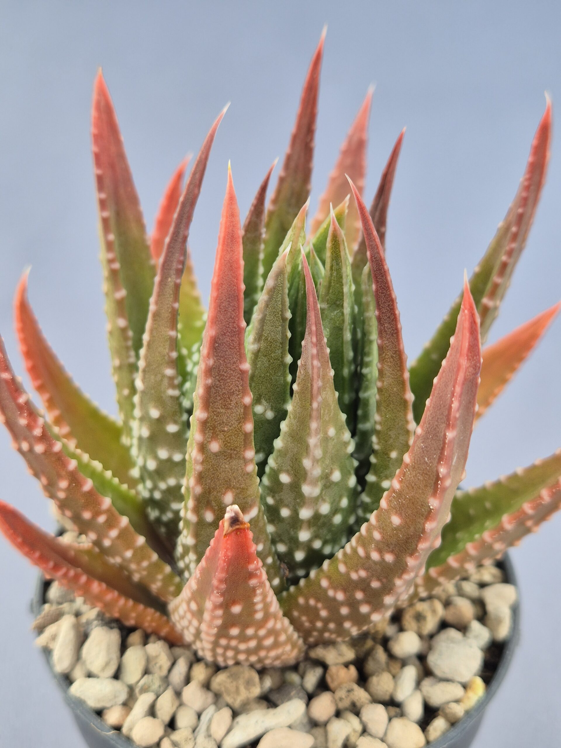 Esta Tulista híbrida destaca por su porte compacto y sus hojas puntiagudas con tubérculos blancos contrastados, que le dan un aspecto muy escultórico y llamativo. Presenta tonos rojizos en las puntas cuando recibe buena iluminación, lo que realza aún más su carácter ornamental.