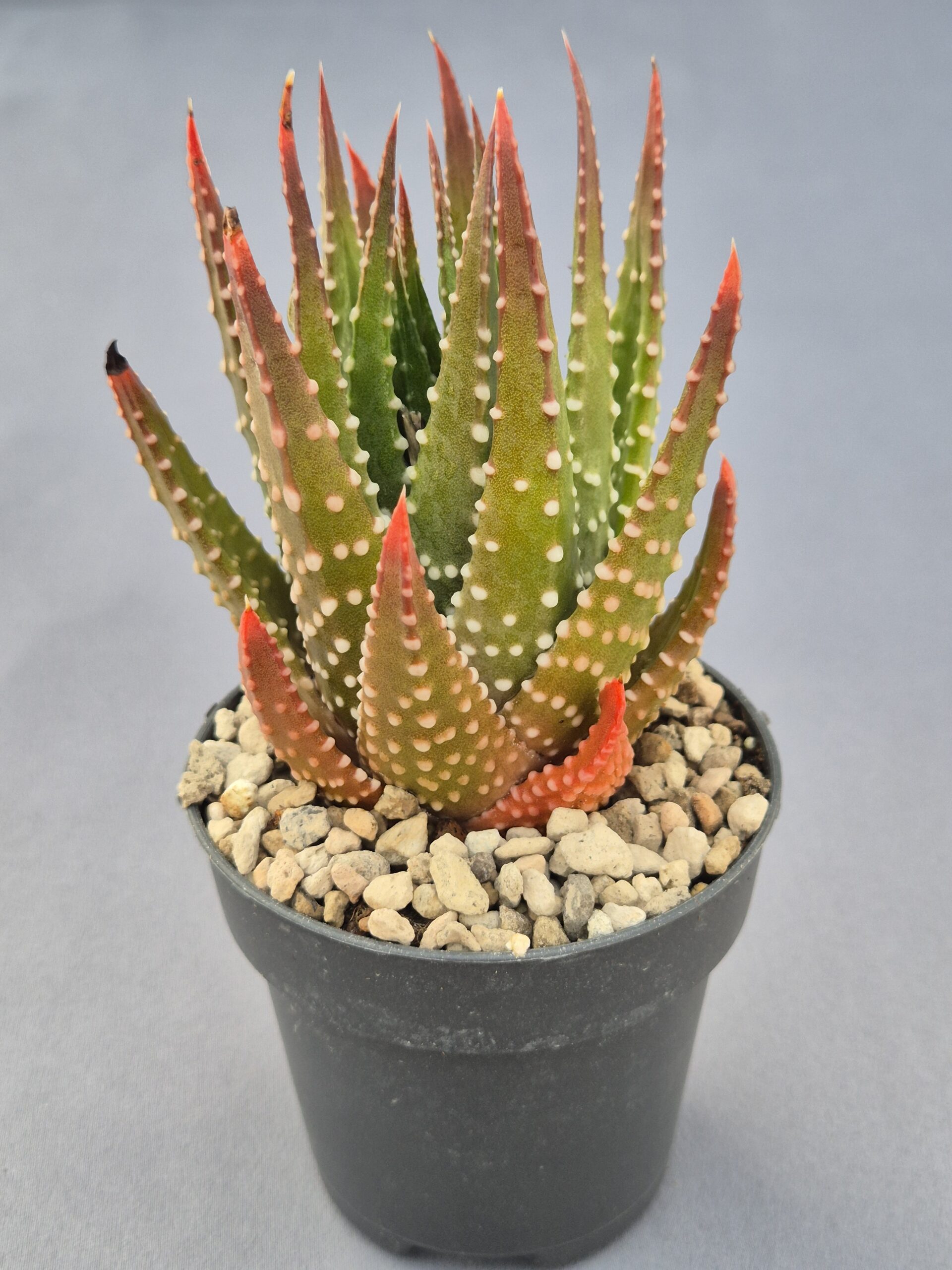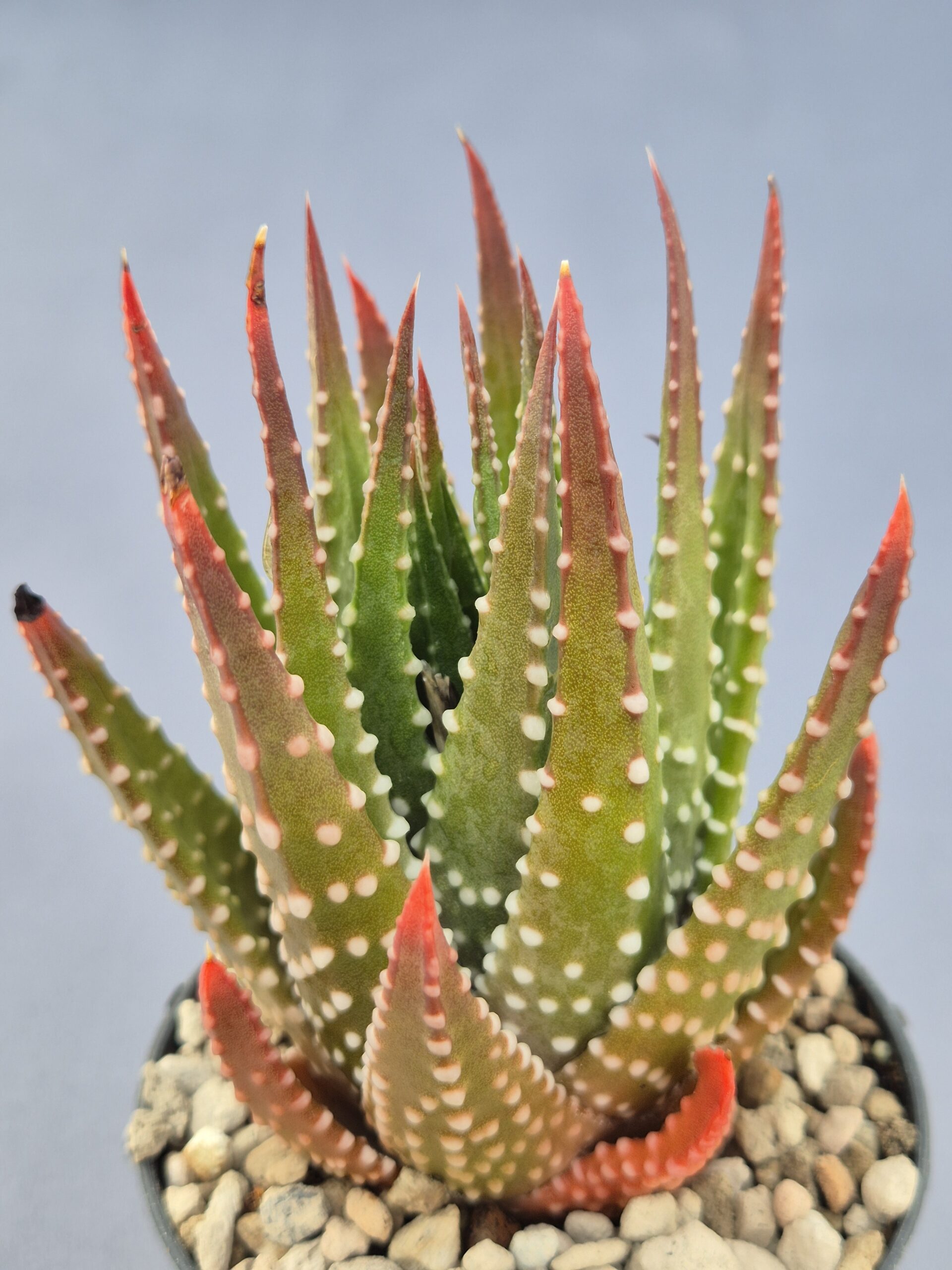 Esta Tulista híbrida muestra un crecimiento compacto y simétrico, con hojas rígidas y puntiagudas que presentan una llamativa combinación de tonos verdosos y rojizos. Su superficie cubierta de tubérculos blancos le da un aspecto muy ornamental y característico dentro del género.