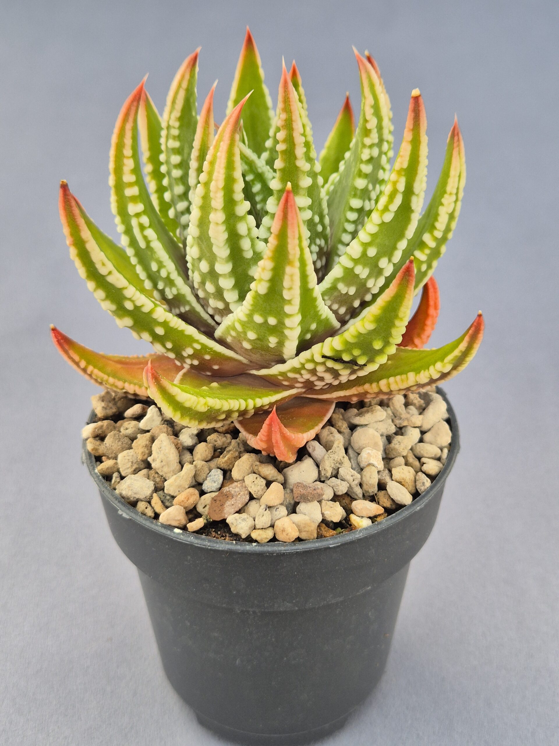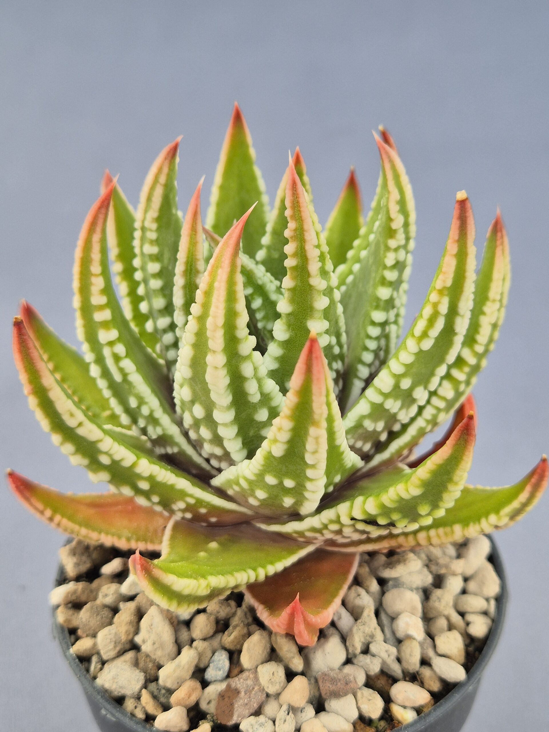 🎨Color: predominan los verdes intensos con tubérculos blancos muy marcados; las puntas muestran tonos rojizos que se vuelven más fuertes con el estrés lumínico.