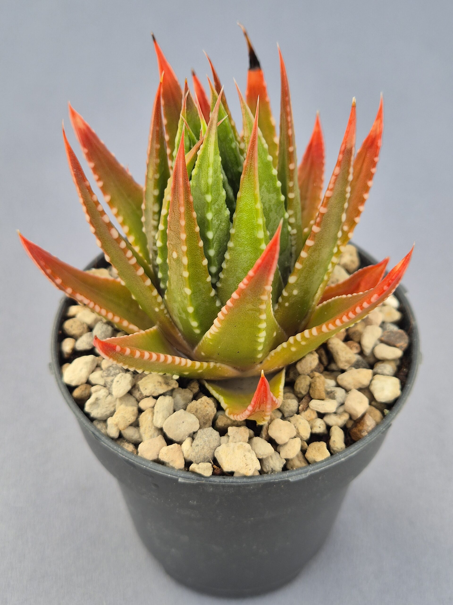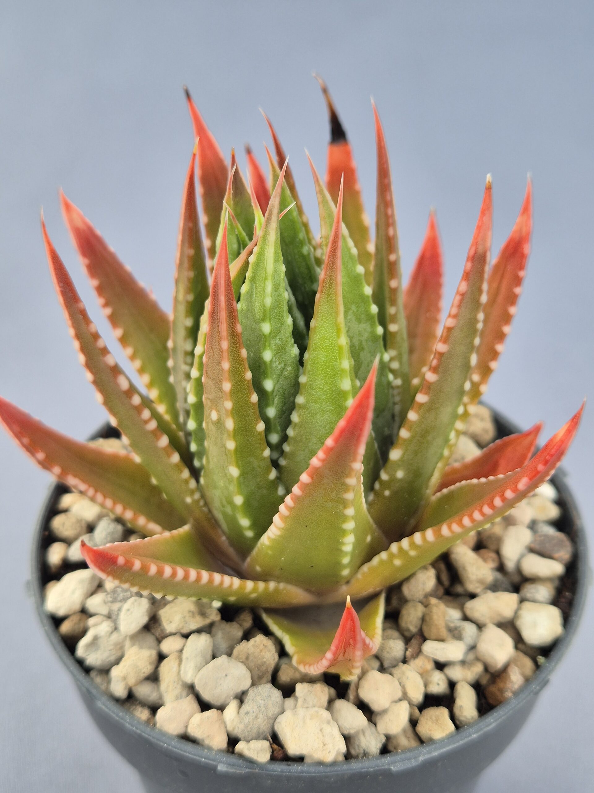 Esta espectacular suculenta híbrida combina la robustez de Tulista marginata con la marcada ornamentación de Tulista pumila. Su porte es compacto pero muy llamativo, especialmente por los bordes rojizos intensos que adquiere bajo buena iluminación.