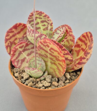 Huernia zebrina variegada es una suculenta de colección que no pasa desapercibida. Con tallos angulosos cubiertos de pequeños dientes y una asombrosa variegación en tonos verde, amarillo y rojizo, esta planta tiene una apariencia casi alienígena. Su valor ornamental no solo radica en su estructura escultural, sino también en su floración exótica en forma de estrella con patrones similares a los de una cebra.
