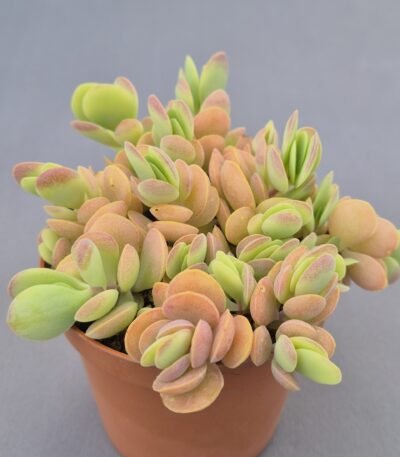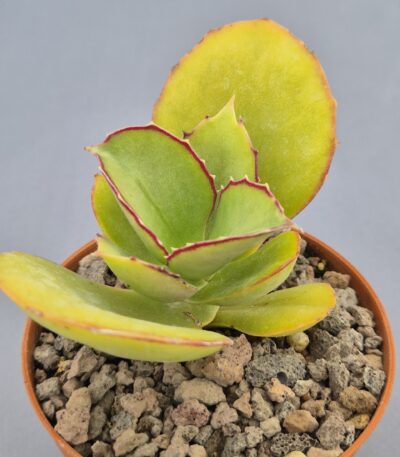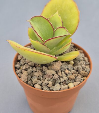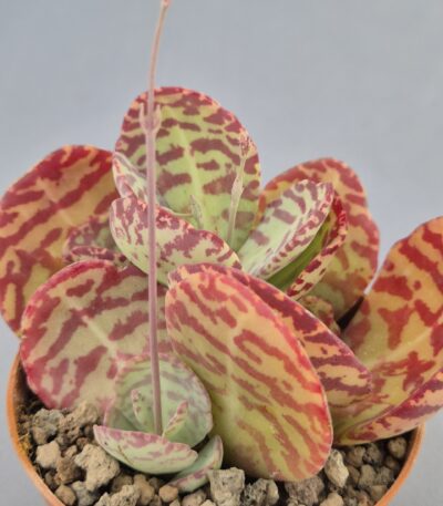 Kalanchoe synsepala es una suculenta vigorosa y muy ornamental, conocida por su crecimiento expansivo y su capacidad para emitir largos estolones que producen nuevas rosetas. Su porte abierto y su contraste de colores la convierten en una planta dinámica y muy atractiva en cualquier colección.